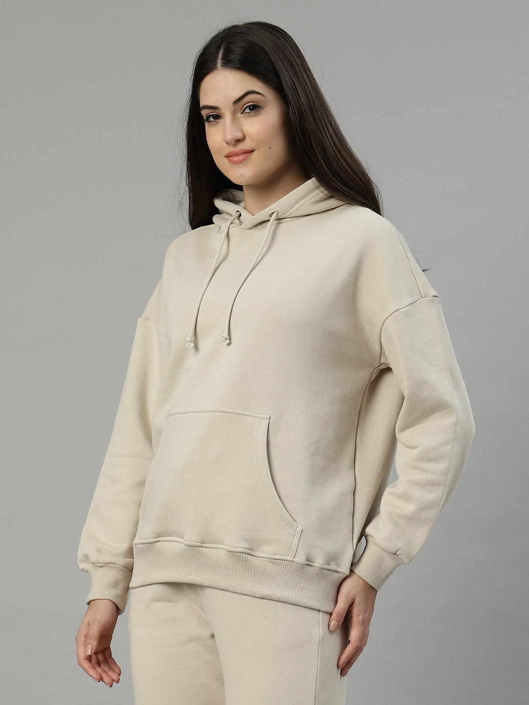 Unaone Pure Cotton Fleece Beige Oversized Full Sleeve Winter Wear Hooded Sweatshirt For Women
